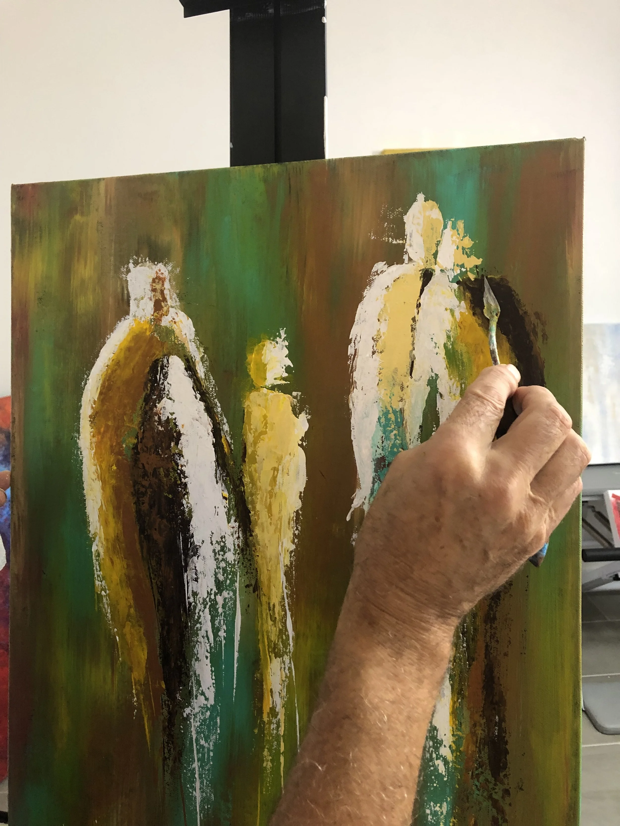 Utilizing the spatula technique as well as paper fit spotting, Robert applies to each of his piece a rich tangible texture, giving the beholder a unique perspective of the dimensions of every tantalizing tableau.